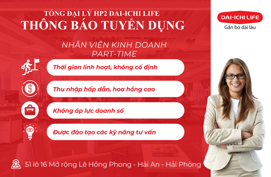 TUYỂN DỤNG NHÂN VIÊN KINH DOANH PART-TIME Vị trí: Nhân viên phòng Kinh doanh Số lượng: 05 Địa điểm làm việc: Số 51 lô 16 Mở rộng Lê Hồng Phong – Hải An – Hải Phòng 1. Mô tả công việc: – Tư vấn, giới thiệu sản phẩm/dịch vụ của công ty đến khách hàng […]